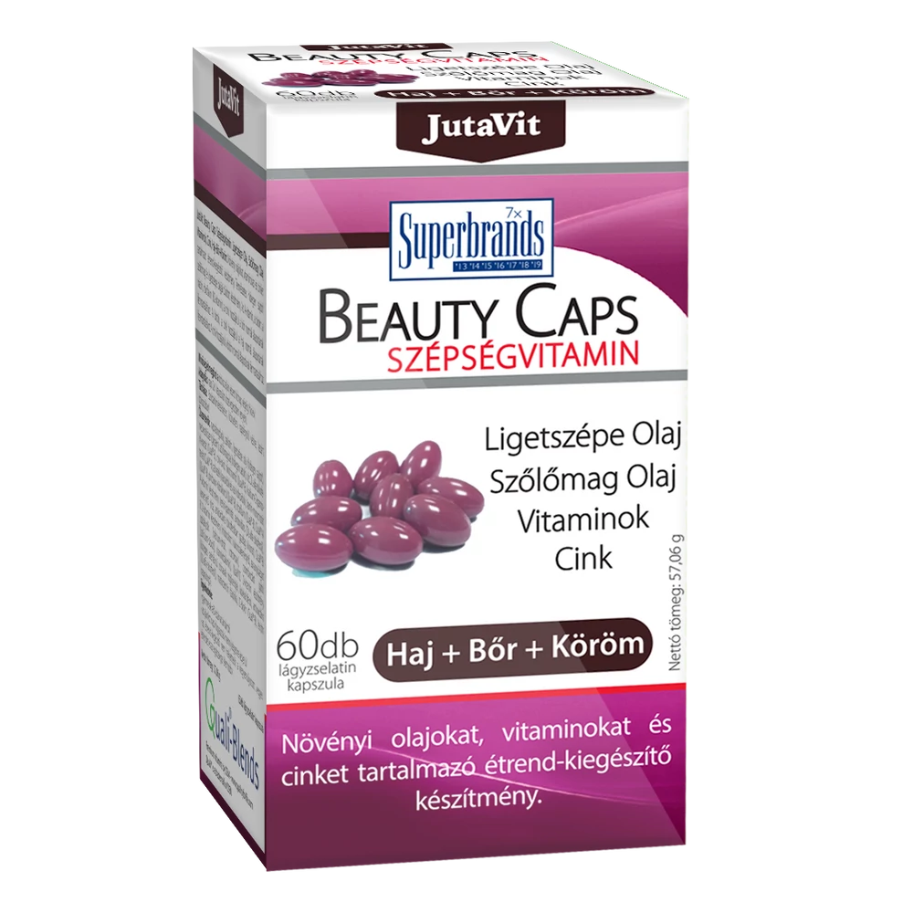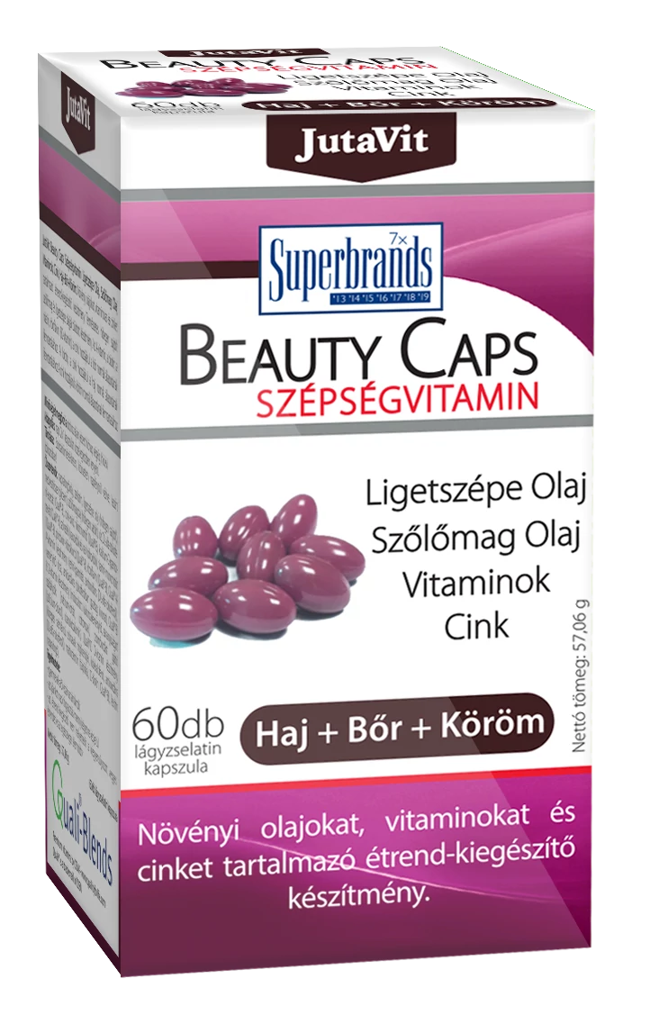 JutaVit Beauty Caps Szépségvitamin Ligetszépe Olaj, Szőlőmag Olaj Vitaminok, Cink, Haj+Bőr+Köröm. Növényi olajokat, vitaminokat és cinket tartalmazó étrend-kiegészítő készítmény. Természetes hidegen sajtolt szőlőmag és ligetszépe olajjal dúsított készítmény. Az A-vitamin, a biotin, a niacin, riboflavin (B2-vitamin), a cink hozzájárul a bor normál állapotának fenntartásához. A biotin, a cink hozzájárul a haj normál állapotának fenntartásához. A cink hozzájárul a köröm normál állapotának fenntartásához.